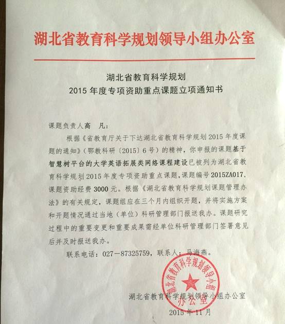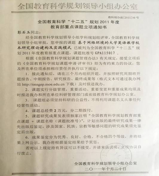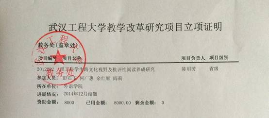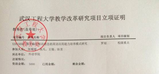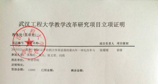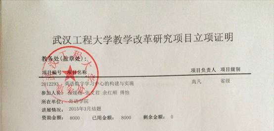 为配合本轮教学改革,2012至2016年期间,本申报组成员共主持完成各级各类课题12项,作为核心成员参与2项。其中省部级3项,省级8项,校级及重点3项。课题内容涉及自主学习理论,自主学习实践,自主学习校本课程建设,自主学习与学生能力培养,大学英语拓展类课程网络平台建设及交互英语网络数字课程平台建设等各个方面。这些课题均围绕“基于“交互英语教学云平台”的大学英语教学改革与实践”展开,对教学起了极大的理论和实践指导性作用,同时提高了全校英语教学质量和学生英语水平。